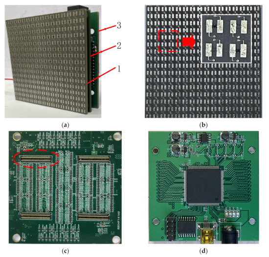 MSRRA prototype. (a) Laminated structure of the MSRRA prototype, from top to bottom; 1 is the MSRRA reflect aperture; 2 is the bias voltage generator; 3 is the beam-forming controller. (b) MSRRA aperture. (c) Bias voltage generator; the BTB connector is marked with a red circle; (d) Beam-forming controller.