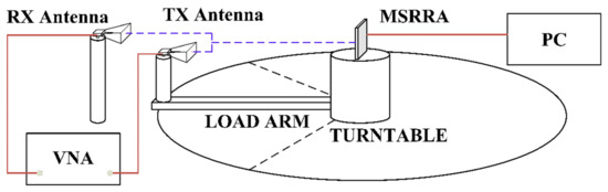 The MSRRA was measured using a far-field testing system in an anechoic chamber. The block diagram and test scene of the experimental scheme are shown in Figure 5. Two wideband horn antennas, whose working frequency band is from 26 GHz to 40 GHz, are employed as the feed to illuminate the MSRRA aperture and as the receiver to capture the electromagnetic wave reflected from the MSRRA aperture. The two antennas were placed perpendicular to MSRRA, both connected to a Keysight Company model N5525B PNA Network Analyzer (PNA), whose working frequency band is from 10 MHz to 50 GHz.