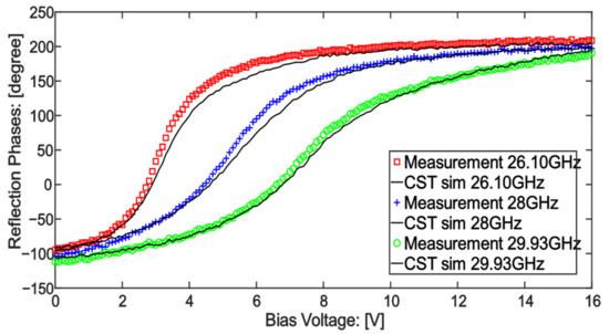 The phase shift from the bias voltage of the varactor of the MSRRA was measured, and can reach over 300 degrees from 26.10 GHz to 29.93 GHz, as shown in Figure 6.