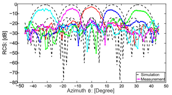 Far-field measurement and simulation results for several steering beams at 28.5 GHz. They show a good degree of agreement with each other. The direction of the reflect single beam is −33° (light blue line), −13° (pink line), 0° (red line), 13° (blue line) and 33° (green line).