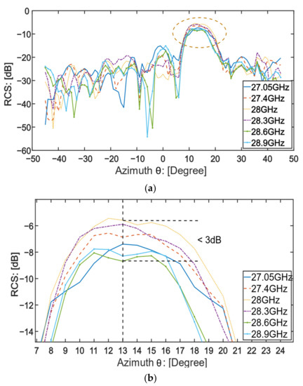 Bandwidth of single beam within −3 dB gain. (a) From 27.05 GHz to 28.9 GHz, the main beam remains very close. (b) Zoom in on the dashed circle of (a).