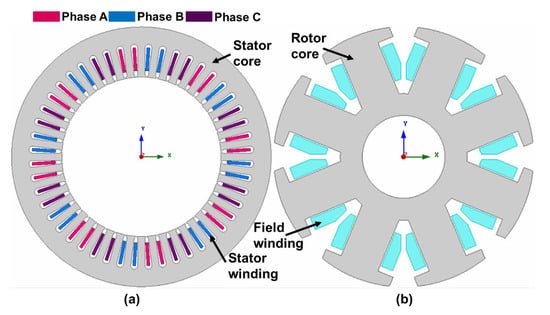 - Ayub, M.; Hussain, A.; Jawad, G.; Kwon, B.I. Brushless operation of a wound-field synchronous machine using a novel winding scheme. IEEE Trans. Magn. 2019, 55, 8201104. [Google Scholar] [CrossRef]