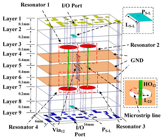 The 3-dimensional structure of the proposed LTCC filter is shown in Figure 1. The filter consists of nine metal layers and sixteen ceramic dielectric layers. The top and bottom layers mainly host I/O ports and tunable components. In the second and eighth layers, there are two short microstrip lines PS-L with a length of LS-L to generate the source-load coupling for skirt selectivity improvement. As shown in Figure 1, Layers 3–7 form the four resonators, which consist of metal via holes and circular patches. Layers 4, 5, and 6 are the ground planes.