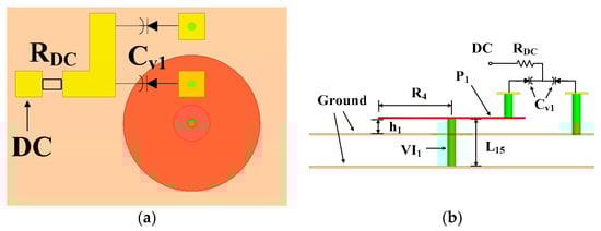 The top and side views of the proposed tunable resonator are illustrated in Figure 2. The resonator mainly consists of a circular patch (P1), a center via (VI1), and two varactors. The varactor is used to tune the resonant frequency of the resonator. H1 is the distance from P1 to the ground. R4 and L15 represent the radius of P1 and the length of VI1, respectively.