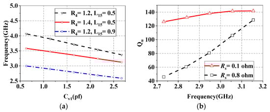 From Equations (2)–(4), we can see that the resonant frequency can be determined using Cv1, Cg, Lvi1, Lvi2, and Lvi3. As shown in Figure 4a, the resonant frequency can be tuned with Cv1. Moreover, with the increase in the R4 and L15, the resonant frequency decreases. Figure 4b shows the simulated Qu versus the resonant frequency under different parasitic resistance Rs. From Figure 4b, it can be seen that the parasitic resistance Rs of the varactor has a great influence on the unloaded quality factor of the resonator.