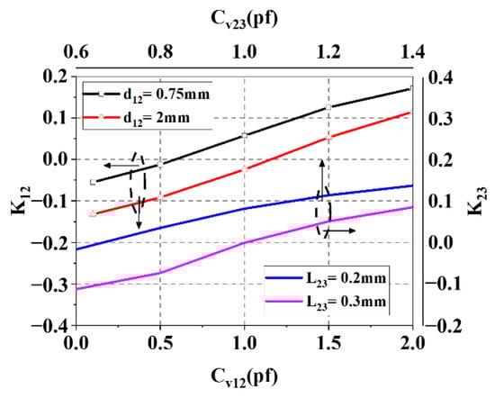 Figure 8 shows the relationship between K12 and Cv12 under the different d12. When Cv12 < 0.59 pf, the mixed coupling coefficient K12 < 0. Further, the main coupling is magnetic coupling. With the increase in capacitance Cv12, the coupling coefficient K12 is positive and electrical coupling is the main coupling. The relationship between K23 and Cv23 under the different L23 is also shown in Figure 8. It can be seen that K23 can be tuned with the Cv23 and its tuning range can be controlled with the L23.