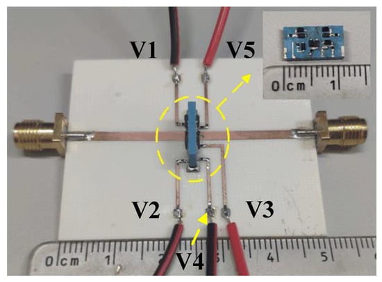 To verify the accuracy of the above design, a four-pole tunable LTCC filter is fabricated, and the layouts are shown in Figure 10. Layers 6, 7, and 8 are the same as layers 4, 3, and 2. The dielectric constant of the LTCC substrate is 7.5, and the loss tangent is 0.006. The test circuit board is Rogers 4003C. There are 16 varactors loaded on the surface of the proposed filter, and their models are SMV1405 (Cv1, Cv2, Cv12, Cv34), SMV1413 (Cvq), and SMV2020 (Cv23), respectively. The RDC is 100 k ohm, and the C1 is 3pf. The locations of the lumped elements are shown on layers 1 and 9 in Figure 10. Table 1 shows the dimensions of the designed filter. Figure 11 shows the photo of the proposed filter. The overall circuit size, including the package, is 11 mm × 6 mm × 1.6 mm.