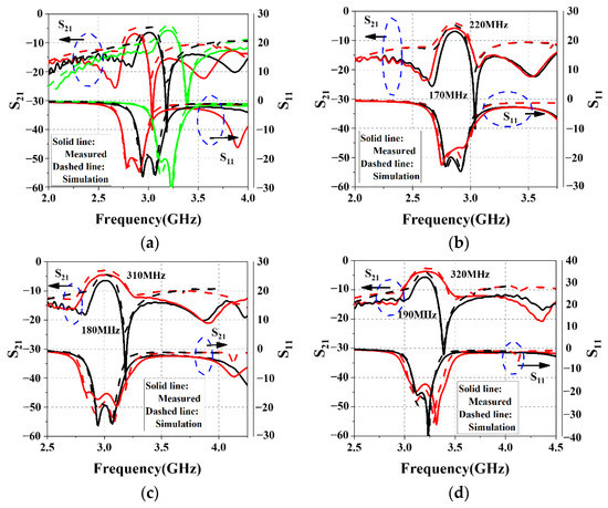 (a) The measured and simulated tuning results of the center frequency. (Red line: 2.86 GHz, Black Line: 3 GHz, Green Line: 3.2 GHz) The measured and simulated tuning results of BW at (b) 2.86 GHz, (c) 3 GHz, and (d) 3.2 GHz. (Red line: the maximum value of BW, Black Line: the minimum value of BW).