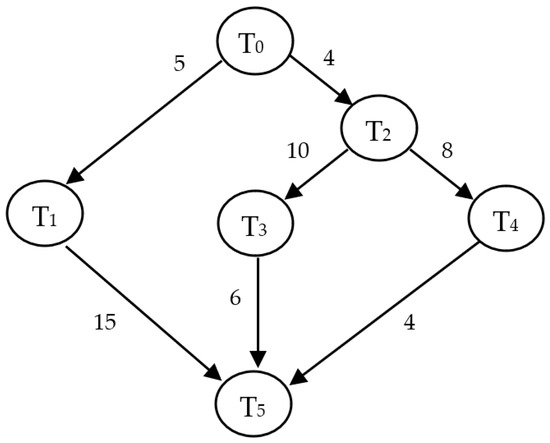 - Task Graph (TG): one of the simplest and most popular methods of representing functions at the system level. It is a directed acyclic graph in which nodes represent tasks and edges represent the order in which tasks are performed (usually representing transmissions). The task is activated when all preceding ones are completed. In this way, sequential dependencies between tasks are presented. Transmission volumes are represented by edge weights. A sample task graph is shown in Figure 1. The graph describes a six-task system. Tasks on the same path in the graph are sequentially executed, while tasks from parallel paths can be executed in parallel. Extended versions of task graphs can also be found in the literature, e.g., conditional task graphs and multimodal task graphs [50,51]. Such models allow for the specification of special cases, such as the conditional or alternative performance of certain tasks.