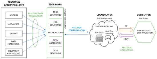 In the case of real-time systems, there is a time limit on obtaining a response, which means that once a request is sent, a response is expected to be obtained within an assumed maximum time (deadline). Exceeding this time can be treated as an error (systems with hard constraints) or as a reduction in service quality (systems with soft constraints) [111]. Requests can be sent by either end devices or server or client applications. In order to reduce the occurrence of the aforementioned errors or to maintain the required level of quality of service in IoT systems, one can use the solutions described earlier, such as edge computing, fog computing, SDN, NFV, real-time databases, scheduling methods, and relevant communication protocols. These elements are described in Section 3 and Section 4 of this article, and based on them, an illustrative architecture for a real-time IoT system can be proposed, as shown in Figure 2. In the architecture, the following computing layers that can perform various tasks of the IoT system can be distinguished: