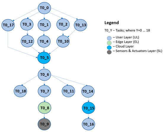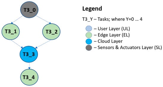Similar to the task graph shown in Figure 4, the tasks described for the problem of collecting/updating data on weather conditions also have sensor readings (T3_0) as the starting point/trigger for system operation. Then, through the network infrastructure, the temperature (T3_1) or the atmospheric pressure (T3_2) information is transmitted to the servers that make up the CL layer level of the system. In the next step (T3_3), the central server receives queries from the EL layer and starts the processes necessary to perform the called functions. Processes can be considered successfully completed when the end result at the EL layer is the launch of a procedure that receives confirmation of the completion of cloud processing for database updates (T3_4).