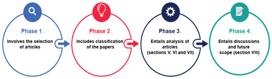 In this section, we follow the same research methodology presented by [9,10]. As indicated in Figure 1, the research methodology used here is separated into four phases. The first phase (Phase 1) involves the selection of articles. The papers are then classified in Phase 2. Phase 3 entails the analysis of articles, which is discussed further in Section 5, Section 6 and Section 7. Phase 4 entails discussions and future scope, which will be detailed in Section 8.