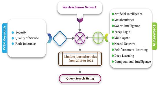 - Step 2: Selection and screening of articles Research-related terminology, simple phrases, and Boolean operators make up the search queries. The figure in Figure 2 depicts the entire task of forming query strings. To uncover the important relevant publications from 2010 to 2022, search queries are executed on abstracts, keywords, and titles from the selected sources. Journal papers are considered, whereas other categories are omitted. The subsequent search results are gathered and sorted to realize the most important works, rejecting irrelevant, duplicated, or poor quality papers. Furthermore, in order to establish if the filtered papers are eligible for our aims, the abstract is reviewed first, and if it does not provide a sign of eligibility, the article’s content is examined. The 95 most significant papers are designated as primary papers using this method.