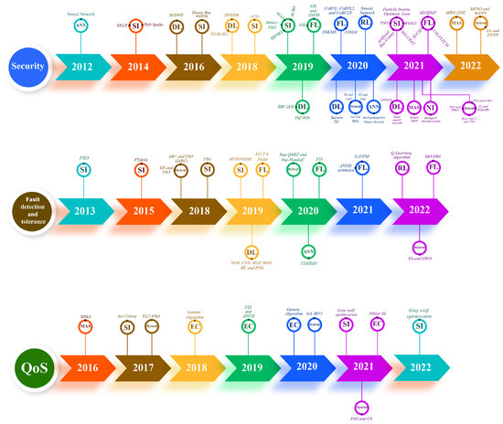 - An overview and detailed discussion of current research that used various AI methodologies to accomplish certain WSN objectives between 2010 and 2022 is provided. We include a thorough discussion of the main WSN Security, Fault Detection and Tolerance, and QoS problems that were addressed using AI-based solutions.