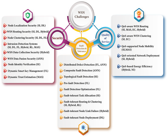 In this section, we initially present the security, fault detection and tolerance, and QoS problems in WSNs. Then, various AI approaches for WSNs are discussed.