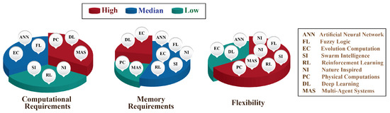 - Learning MethodsWithout being specifically designed, learning is the capacity to spontaneously acquire new knowledge and enhance it through experience [44]. Examples of such AI methods include Reinforcement Learning (RL), Artificial Neural Networks (ANN), and Deep Learning (DL).ANNs have proven effective in handling complicated problems due to their capacity to replicate biological brain networks and human qualities. New data samples can be supplied after an ANN has been trained using training data sets, allowing the trained ANN to be utilized for forecasting and classifying purposes. The capacity to describe non-linear and complicated functions without much disruption between input/output variables is a fundamental benefit of employing ANNs over other approaches. Many problems involving optimization, function approximation, time series analysis, etc., are solved using it. Radial Basis Function network, Multi-Layer Perception (MLP), Back-Propagation, and Recurrent Neural Network (RNN) are examples of ANN designs found in the literature [27].RL is a field of AI that deals with how intelligent creatures should behave in a particular situation in order to maximize the idea of cumulative reward. In the RL process, learning is performed by the interaction between the learning entities and their surrounding environment. The three elements of RL are the value function, reinforcement function, and environment. The RL context is frequently dynamic, with a variety of states where each state has a set of feasible options at any given moment [45].DL is an interesting AI method using representation learning since it can learn without supervision and from unstructured and unlabeled data. DL design contains several levels and is regarded as a universal learning method that is utilized to solve a wide range of problems [46]. DL is also utilized to handle big data challenges and produce effective data abstractions and representations [47]. DL differs from other machine learning algorithms in that feature extraction is expressed on numerous hierarchical levels. DL is currently being utilized in a variety of scenarios where intelligent machines is beneficial: