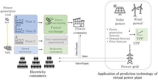 As shown in Figure 1, in the case of the currently produced electricity in Republic of Korea, it is collected by the network manager, Korea Electric Power Corporation, through the transmission network and then delivered to the user through the distribution network. Such a centralized management system is now changing to a distributed power generation system to compensate for the limitations in managing distributed power sources of various sizes distributed nationwide. The distributed power generation system supplies distributed resources to consumers by using small-scale power generation facilities in the vicinity of the consumers. However, when operating as such a distributed power source, each individual power source participates in the supply of electricity, and in this case, an error in the prediction of the amount of electricity generation increases, resulting in system operation problems. To solve this problem, the Korean government opened the power brokerage market in February 2019, and a Virtual Power Plant (VPP) that plays the role of brokerage transaction was created in this market.