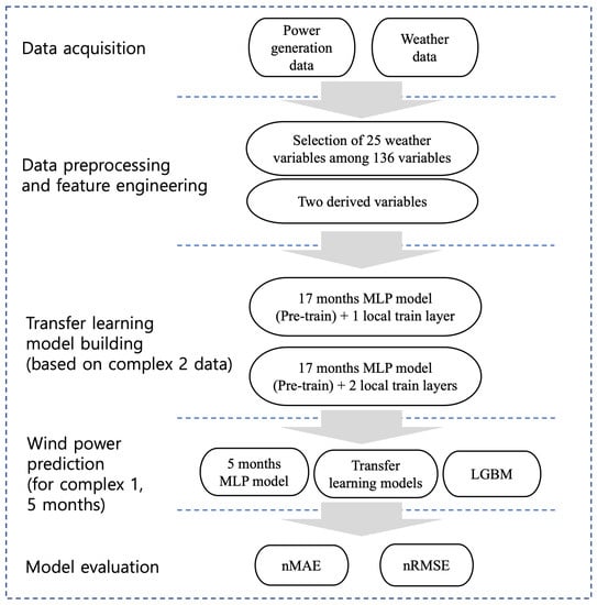 In this study, after pre-learning 17 months of data from Yeongheung wind power complex 2, we will examine the performance of the transfer learning approach model for predicting the generation amount of Yeongheung wind power complex 1, which has relatively little data (5 months). To this end, the approach as shown in Figure 3 is as follows: First, with the wind power generation data and weather forecast data obtained from the Republic of Korea public data portal (www.data.go.kr, accessed on 6 December 2022), data preprocessing was carried out. In this study, min-max scaling, removal of missing values, removal of outliers, addition of derived variables, and data reduction through feature selection were performed for data preprocessing. Furthermore, in order to know the actual amount of power generated by the wind turbine, the amount of power generation by time period was separately calculated. In this study, variables that are judged to be somewhat related to the amount of power generation among a total of 136 weather forecasting variables were narrowed down through correlation analysis and qualitative judgment. Variables with high quantitative correlation coefficient values but also variables related to some basic weather variables such as NCPCP, SNOL, LCDC, and so on, even if the correlation coefficient values were low, were selected because other variables of more than 100 types, such as friction velocity, ICAO height of convective cloud base, and fog fraction, are judged to be difficult to affect wind power generation or can be replaced with these basic variables, and as shown in Table 2, finally 25 variables were selected and used in our model. In addition, in this study, to predict the one-day-ahead wind power generation in a more accurate manner, two variables were additionally derived and used in our model: (1) wind speed variable for predicting wind speed at the location of the wind power generator rather than at the meteorological observation point and (2) wind-speed-derived variable considering the correlation with power generation. Then, a transfer learning model was created to predict complex 1 data by adding one and two local train layers, respectively, to the pre-trained MLP model using data from complex 2 with 17 months of data. The performance of the transfer learning approach was evaluated by comparing with the MLP-trained model without transfer learning and the Light Gradient Boosting Machine (LGBM) model with 5 months of data in complex 1. For evaluation, MAE and RMSE indicators were used. In this study, we have developed a one-day-ahead forecasting model that predicts the amount of power generation from 00:00 to 24:00 the next day with the weather numerical model data obtained around 14:00 the day before. The overall approach for our study is depicted in Figure 3.