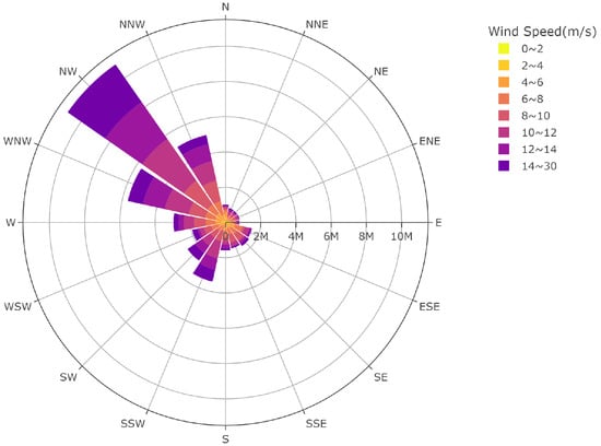 Figure 4 shows the distribution of wind speed forecast data for 17 months at Yeongheung wind power complex 2. In fact, the distribution of the wind speed forecast data of the Yeongheung wind power complex 2 ranges from 0 to 30 m/s, but the wind speed exceeding 23 m/s appears very rarely, so it was judged to be an outlier and excluded from Figure 4. Considering that the minimum wind speed (start-up wind speed) at which the wind power generator starts generating electricity is 3 m/s, it can be seen that the wind speeds blowing in the Yeongheung wind complex are sufficient to generate electricity. The blades of the Yeongheung wind power generators are mainly directed to the west coast, and this is due to the fact that the yawing system senses the wind direction and rotates it around the vertical axis according to the geographical characteristics of Republic of Korea that are affected by the northwest monsoon wind. In Republic of Korea, it is known that the proportion of northwest winds is high in winter (December to February), and the proportion of southwest winds, such as southwest and southeast winds, is high in summer (June to August). Figure 5 shows the size of the amount of power produced by wind direction. Here, M in 2 M, 4 M,⋯, 10 M on the horizontal axis means megawatts. In Figure 5, the wind speed predicted in Yeongheung wind power complex 2 is distributed in the range of 0 to 30 m/s, which is divided into 2 m/s units. There were 545 time slots where wind speeds of 14 m/s or higher were forecasted, and they were merged into one category as there were fewer than 717 times when wind speeds were predicted to be between 12 and 14 m/s (717 times). A closer look at Figure 5 shows that the main wind direction of the Yeongheung wind power generators is the northwest wind, and the wind direction and wind speed with the largest amount of power generation were confirmed to be the northwest wind direction (NW) and 10 to 12 m/s speed, respectively.