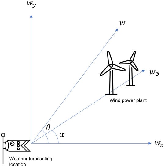 In this study, to understand how wind speed forecasting data actually affected the amount of wind power generation, we estimated the wind speed at the generator location () based on east–west wind speed and north–south wind speed at the weather forecast location (refer to Figure 7). The closest meteorological observation point to the Yeongheung wind power complex is about 4 to 5 km away from each wind power generator, and the angle between the meteorological observation point and the wind power complex is also distributed over a wide range. The wind speed data provided by the LDAPS meteorological model includes east–west wind speed (u) and north–south wind speed (v). From the u and v wind speeds, according to ECMWF [22], the wind direction () can be obtained as follows.