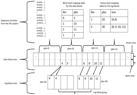 This paragraph reviews the BAST scheme briefly. The file system sees the flash drive as a series of logical sectors, i.e., a block unit equivalent to a hard disc. Therefore, the FTL write interface is set to: Writing (lsn, industry), which means writing the logical sector number lsn to the position of the ‘a given sector’ [19]. When the FTL receives a file system written order, it will find a physical position in the flash memory of a field to write: first it will determine the logical (short, lbn) block number with the specified lsn and then obtain the physical number (shortly, pbn) of the block mapping table for lbn. Next, the four offset measurement in the physical block found to write sector data. Finally, the sector writes in the data block at the offset identified (which is another representation of the physical block).