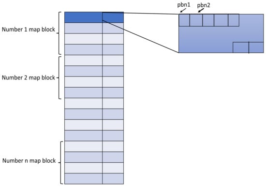 It is critical to think of a storage scheme for mapping eight. If a power-on operation happens, the mapping table must be recoverable. In the case of a sudden power-off, mapping information loss should be recoverable. As a result, these data must be saved in some kind of flash memory. There are two methods for storing mapping information in flash memory: the map block method and the per block approach. A map block technique places mapping data in distinct blocks with flash memory known as the map blocks. Most of the FTL-based implementation methodologies utilize several map blocks. Figure 5 shows the procedure for map blocks and how they store information about mapping [2].
