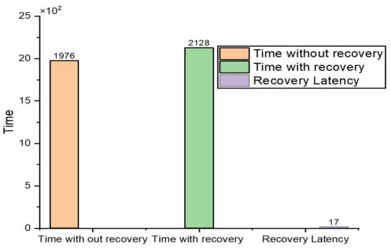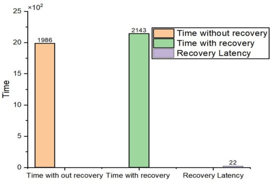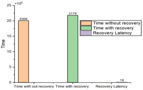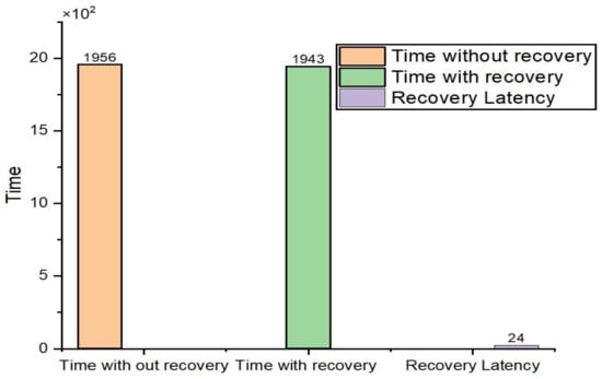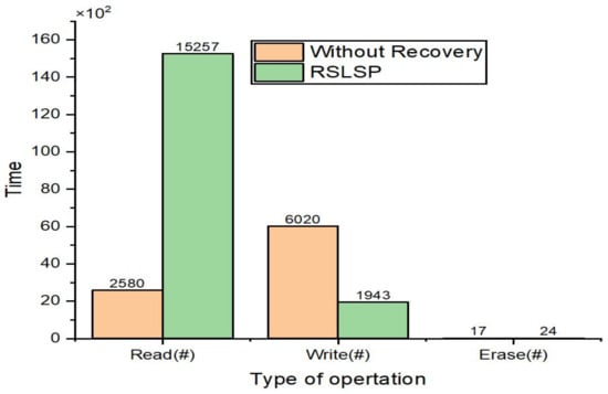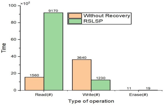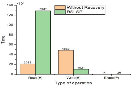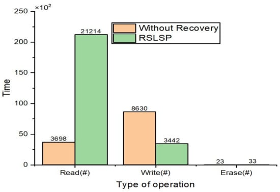 We used the RSLSP protocol in BAST, which is one of the FTL algorithms, to test its performance characteristics. Our protocol, on the other hand, can be used in any FTL algorithm. Table 3 displays the four traces that we used to test our protocol in the experiment. Various forms of traces were used in the experiment. The experimental findings of the RSLSP scheme, without recovery scheme, and with recovery scheme are seen in Figure 7, Figure 8, Figure 9, Figure 10, Figure 11, Figure 12, Figure 13 and Figure 14. We counted the number of write, read and erase operations and the amount of time taken to complete the task. Furthermore, we also consider the recovery latency. We can see the RSLSP scheme results for four patterns. Figure 7 and Figure 8 show the results for pattern A. Pattern B results are indicated in Figure 9 and Figure 10. Moreover, Figure 11 and Figure 12 show the results for pattern C. Finally, the results of pattern D are revealed in Figure 13 and Figure 14. These figures show that the RSLSP scheme requires a small time of recovery latency to guarantee system safety. In addition, the performance gap between our scheme and without recovery scheme in read and write operations is in accordance with the characteristics of shadow paging technique. The proposed RSLSP shows the effectiveness in terms of the recovery latency and time. The results are cross verified using different patterns.