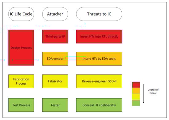 With the rapid development of the integrated circuits (IC) industry in recent years, the IC supply chain is becoming globalized. Traditional strategies to solve information security issues based on the reliability of the underlying hardware and thereby add safeguards have become less trustworthy []. The direct or indirect involvement of an untrusted party in the design, fabrication, and testing process of an IC results in an “uncontrolled” phase of the IC’s life cycle that can be exposed to an attacker []. The intellectual property (IP) vendor who is not trusted in the design process of the integrated circuit can insert a malicious circuit, which is the so-called “hardware Trojan”, and the EDA tools that are not trusted may also automatically insert hardware Trojans in the process of design. During manufacturing, the foundry must reverse engineer the IC to be able to insert a hardware Trojan. During testing, testers may conceal the existence of hidden hardware Trojans. The threats to an IC during the whole life cycle is shown in Figure 1, wherein the graph label shows the threat degree from high to low with respect to the color changes. The most dangerous phase is that IP vendors directly insert hardware Trojans into the circuit, for the reason that IP vendors can directly access the unencrypted RTL code, and IP transactions are generally in the form of encrypted netlists. As a consequence, IP buyers cannot judge whether the IP contains additional malicious circuits. The harm of EDA tools inserting a hardware Trojan is the second, even if an untrusted EDA tool has the ability to insert hardware Trojans, it can only insert automatically. In this case, the placement, size, characteristics of hardware Trojans cannot be well controlled, which explains the reason why the hardware Trojans are not so covert. IP designers can compare the results obtained by different EDA tools. Therefore, it will be easier for them to find the existence of hardware Trojans. If the foundry wants to insert hardware Trojans by reverse engineering, the cost of the time and money will be ultrahigh. Furthermore, deliberately concealing the existence of hardware Trojans in the test process will indirectly cause the threat of hardware Trojans to an IC.