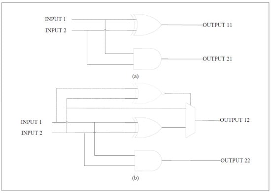 The design of a simple hardware Trojan circuit was exhibited in Figure 3. Figure 3a is the original circuit design, Figure 3b is the design with the hardware Trojan trigger circuit inserted. It is obvious that and are different only when = = 1, whereas in the case of other conditions, the output of the circuit (b) can be consistent with that of the circuit (a). According to this principle, the attacker can design a small probability trigger circuit as the hardware Trojan trigger circuit.