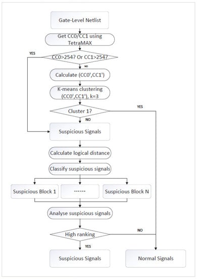 Figure 4 shows the proposed flow diagram. First, it takes the gate-level netlist of the hardware Trojan benchmarks as the input to analyze testability in TetraMAX, so as to determine the values of controllability/observability, and directly classify the signals with controllability/observability value greater than 254 as suspicious signals. It should be noted that TetraMAX limits the values to 254 when considering the SCOAP value, which means that the signal has very poor controllability. Secondly, the differential amplification model proposed in [] was utilized to process the value of CC0/CC1 to obtain the value of CC0/CC1. Thereafter, k-means clustering was performed to classify all signals into three clusters, among which signals in cluster 2/3 were classified as suspicious signals whereas signals in cluster 1 were classified as normal signals. At this point, we can put the hardware Trojan trigger signal into the suspicious signal. Thereby, excluding the false positive signals from the suspicious signal is of great significance. Therefore, we calculate the shortest path between suspicious signals, that is, the suspicious path of these signals. In this way, the mutual relation between suspicious signals can be obtained, and the associated suspicious signals can be divided into a group, which can be defined as suspicious circuit blocks. Finally, in each suspicious circuit block according to the number of forward relevant suspicious signals, the number of suspicious paths are sorted to find the end of suspicious signal transmission, which is most likely to be the trigger signal.
