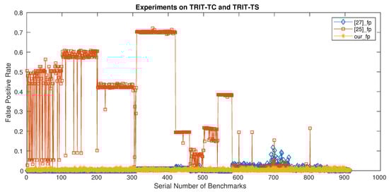 In reality, it is hard to find actual instances of hardware Trojans, so the researchers mainly use Trust-Hub [], which is a hardware security and trust website that has a list of hardware Trojan test benchmarks in the form of gate-level netlist as standard benchmarks to evaluate detection methods. Among them, TRIT-TC and TRIT-TS are 914 different hardware Trojan benchmarks designed by Cruz et al. based on the ISCAS. The designs are mainly based on the circuit c2680, c2540, c5315, c6288, s13207, s1423, s15850, s35923 to insert hardware Trojans, whereas the difference lies in the insertion of the hardware Trojan type, the trigger condition, and the position. Because these are two libraries with relatively comprehensive hardware Trojan types at present, and ref. [] have conducted experiments on TRIT-TC and TRIT-TS, our scheme is thereby applied to these 914 hardware Trojan benchmarks to compare the detection results.