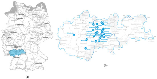 Geographical location and supply area of VRNnextbike. The system operates in three federal states (Rhineland-Palatinate, Hesse and Baden-Wuerttemberg). (a) Geographical location of the VRNnextbike area. (b) Detailed view of the VRNnextbike area.