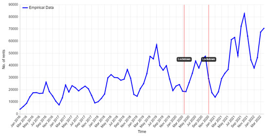 As noted in Section 3.1, the COVID-19 pandemic had an impact on BSS and its rental activities. In a previous study, it was found that the effects of COVID-19 restrictions varied for BSS [33]. Thus, more rental bikes were used in the second lockdown (November 2020–June 2021) than in the first lockdown (March–June 2020), although the restrictions on the population were significantly increased in the second lockdown. This fact could explain why the COVID-19 numbers as an exogenous factor had no significant influence on the model. After the restrictions were gradually lifted from June 2021, the number of rentals grew considerably, so the empirical values are underestimated.