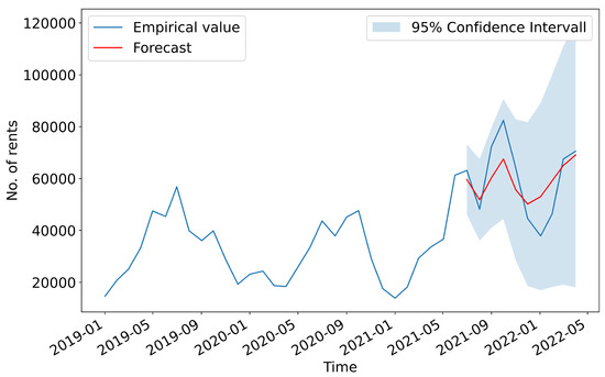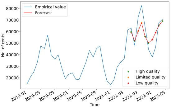 In order to be able to evaluate the forecast quality on a monthly basis more precisely, a consideration of the absolute and relative differences between the empirical and predicted values is used. Three quality levels for residuals were defined and mapped to the forecast. The levels are defined as high, limited and low quality. The quality is determined on the basis of two key indicators. The first indicator is the difference between predicted and empirical value, while the second indicator is the quotient of predicted and empirical value. High quality is achieved if the forecast value does not fall below or exceed the threshold value of 10,000 rentals. A 30% interval is specified for the quotient, which means that the forecast value may deviate by a maximum of 15% upwards or downwards from the empirical value. The forecast quality is limited if the difference is between 10,000 and 15,000. For the quotient, the interval is extended to 50%. This means that the forecast values may deviate upwards or downwards by more than 15%, but not more than 25%. The forecast is of low quality if the threshold of 15,000 for the difference and the 50% interval are exceeded. The threshold values for the evaluation of the residuals were chosen arbitrarily. The evaluation of forecast quality in other scientific fields or applications might demand other thresholds or more elaborate statistical methods.