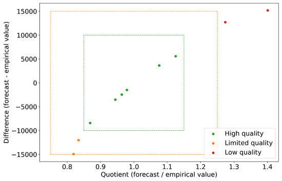 Figure 5 shows the quality levels of the forecasts based on the previously defined indicators by mapping the calculated quality to each forecast data point. The residuals are calculated based on the deviation in the difference between the forecast and empirical value. Figure 6 indicates the forecast quality of the UCMX model based on the residuals and the quotient, as well as the set bounds.