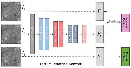 In recent work, convolutional neural networks have attracted a great deal of attention due to their remarkable success in computer vision. FlowNet [21] is the first end-to-end supervised optical flow learning framework, which takes an image pair as the input and outputs a dense flow field. FlowNet2 [22] is later proposed to improve the accuracy by staking several basic FlowNet modules for refinement. PWC-Net [23] computes optical flow with CNNs via a pyramid, warping, and cost volume. LiteFlowNet [24] achieves start-of-the-art results with a lightweight framework by warping the features extracted from CNNs. ARFlow [25] introduces an unsupervised optical flow estimation by the reliable supervision from transformations. RAFT [11] is a new deep network architecture for optical flow estimation using recurrent all-pairs field transformations. GMA [26] solves the occlusion problem by introducing a global motion aggregation module. Recently, Cai et al. [9] proposed the dense motion estimation of particle images via a convolutional neural network base on FlowNetS [21], and the corresponding CNN model is trained with a synthetic dataset of fluid flow images. They later [10] introduced an enhanced configuration of LiteFlowNet [24] for particle image velocimetry, which achieves a high accuracy via training the corresponding CNN model using different kinds of fluid-like images. However, these CNN-based motion estimators do not outperform the well-established correlation-based optical flow methods for all aspects, and the accuracy of them is largely determined by the training data. Masaki et al. [27] introduced convolutional neural networks for fluid flow analysis, toward effective metamodeling and low-dimensionalization. It considers two types of CNN-based fluid flow analyses: CNN metamodeling and CNN autoencoder. For the first type of CNN, which has additional scalar inputs, they investigated the influence of the input placements in the CNN training pipeline, and then investigated the influence of the various parameters and operations on CNN performance, with the utilization of an autoencoder. Murata et al. [28] proposed a nonlinear mode decomposition with convolutional neural networks for fluid dynamics, which is used to visualize decomposed flow fields. Nakamura et al. [29] introduced a robust training approach for neural networks for fluid flow state estimations, where a convolutional neural network is utilized to estimate velocity fields from sectional sensor measurements. Yu et al. [30] proposed a cascaded convolutional neural network to implement end-to-end two-phase flow fluid motion estimation. Liang et al. [31] introduced particle-tracking velocimetry for complex flow motion via deep neural networks, which has a high accuracy and efficiency. Guo et al. [32] proposed a time-resolved particle image velocimetry algorithm based on deep learning, which achieves excellent performance with a competitive calculation accuracy and high calculation efficiency. In contrast with these existing CNN-based methods [27,28,29,30,31,32] for fluid flow estimation, our method uses a very different network structure, which uses correlation coefficients as the matching costs to enhance the discrimination of the feature matching and overcome the feature distortions caused by the changes of fluid shapes and illuminations, and it also achieves state-of-the-art results on the public fluid datasets.