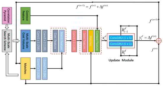 In this section, we introduce a CNN-based update module with a recurrent neural network, which is a gated activation unit based on the GRU cell. As in [11], it takes a context feature, the current matches, the multi-scale cost volume, and a hidden state as input and outputs the updated matches and an updated hidden state. Specifically, its update operator is given as follows: