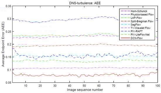 The curves of AEE (average endpoint error) for different optical flow methods (Horn–Schunck [8], Physics-based Flow [38], LAP-Flow [40], Split-Bregman Flow [41], SegFlow [42], TV-Wavelet Flow [39], PIV-RAFT [11], PIV-LiteFlowNet [10], DCN-Flow) on the 100 successive images of DNS-turbulent flow.