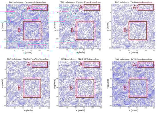 The streamlines of different motion estimators (Physics-Flow [38], TV-Wavelet Flow [39], PIV-LiteFlowNet [10], PIV-RAFT [11], and DCN-Flow) on an image pair from DNS-turbulent flow.