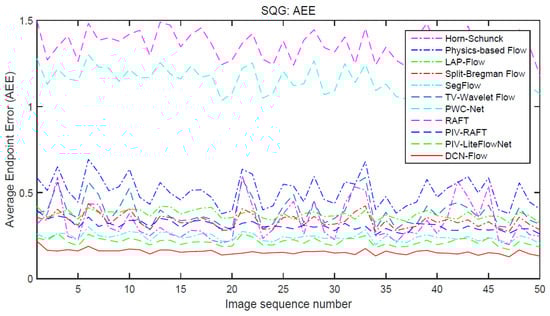 The curves of AEE (average endpoint error) for different motion estimators (Horn–Schunck [8], Physics-based Flow [38], LAP-Flow [40], Split-Bregman Flow [41], SegFlow [42], TV-Wavelet Flow [39], PWC-Net [23], RAFT [11], PIV-RAFT [11], PIV-LiteFlowNet [10], DCN-Flow) on the 50 successive images from SQG flow.
