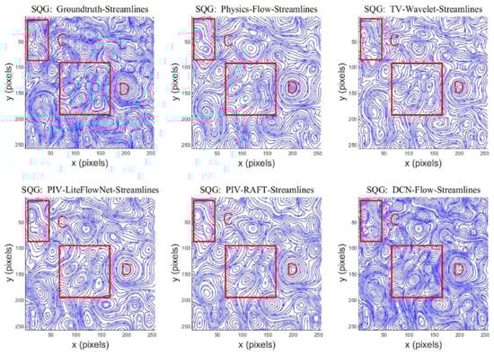 The streamlines of different motion estimators (Physics-Flow [38], TV-Wavelet Flow [39], PIV-LiteFlowNet [10], PIV-RAFT [11], and DCN-Flow) on an image pair from SQG flow.