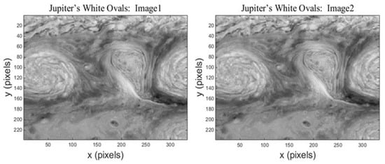 (3) Jupiter’s White Ovals [35]: Jupiter’s White Ovals are distinct storms in Jupiter’s atmosphere, and the remote sensing images are taken by the NASA’s Galileo Solid State Imaging system. It is key to understand the physical mechanisms of their forming and sustaining by extracting the velocity field of Jupiter’s White Ovals by their images. Therefore, it is of great significance to analyze the motion of Jupiter’s atmosphere based on the observed data.