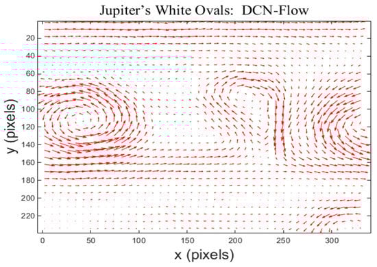 The predicted flow field by our method for Jupiter’s White Ovals is shown in Figure 16. There exist three large vortices in Jupiter’s atmosphere, which correspond to Jupiter’s three white spots. The vortex in the middle of the image is balloon-shaped, and its corresponding cyclone rotates clockwise. The two vortices on both sides of the image are elliptical, and their corresponding cyclones rotate counterclockwise. The streamlines of the predicted flow field in Figure 17 show that our method successfully captured the storms in Jupiter’s White Ovals, including some important small-scale vortices.
