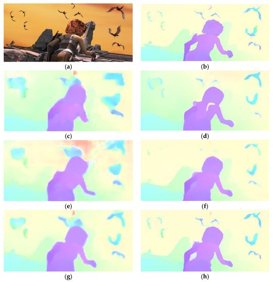 Visual comparison of optical flow fields estimated by different motion estimators: (a) Temple1; (b) ground truth; (c) ARFlow [25]; (d) FlowNet2 [22]; (e) PWC-Net [23]; (f) MaskFlownet [47]; (g) LiteFlowNet3 [48]; (h) DCN-Flow.