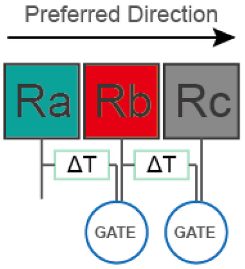 It is intensively investigated that the direction selection neurons release a response signal when the object moves in the preferred direction. When the object moves in the opposite direction, the response is almost nonexistent. Barlow’s activation model is the most famous model for direction selectivity [3]. Figure 1 shows how neurons determine the motion direction of an object as it moves from left to right. Ra, Rb, Rc are three receptors, which respectively receive the optical information of the corresponding receptive field. The delayer is responsible for delaying the transmission of the response in the channel, and the AND gate is responsible or analyzing the two signals received. When the object moves from Ra to Rb, Ra is the first activated receptor and releases a response. The response will be delayed and finally reach the AND gate of Rb. When the object moves to Rb, Rb releases a response. Once the AND gate receives two responses from Ra and Rb, it will be activated. In our previous paper, we proposed a model of local direction detective neuron as shown in Figure 1. We realized local two-dimensional detective neurons, using them to extract two dimensional motion direction information locally and inferred global two-dimensional motion direction of objects [31,32,33,34,35]. However, these studies ingored the difference between left and right eyes. None of them took it into account that humans have two eyes which have different projections on the left and right retinas, nor did them figure out how the human eye perceives the motion direction of three dimensional objects, which could only deal with the direction and speed of two-dimensional motion. As a result, these studies can not detect the three dimensional motion direction.