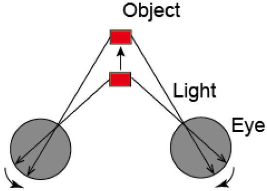 In Figure 4, the red block represents the object before moving, the green block represents the object after moving. The space that objects can reach is divided into three layers according to the distance from the eye. Each layer is a 3 × 3 voxel block. In Figure 4a, the object in the three dimensional space moves one voxel downward. Because the object only moves in the same layer, the direction of the projection motion in the retina all move downward. In this case, the motion of the object in the three dimensional space is similar to the motion projected on the retina. In Figure 4b, the object moves between layers. At this time, the object moves one layer backward on the basis of the Figure 4a. We can find that the corresponding projections on the retina have moved one voxel. In the left retina, the projection moves one voxel to the left, and in the right retina, the projection moves one voxel in the opposite direction.