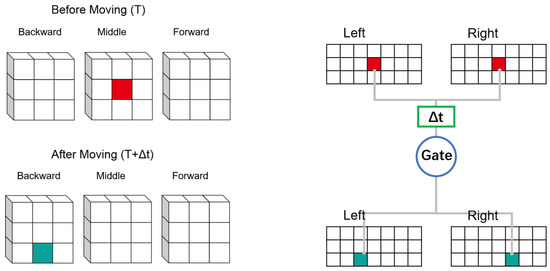 As mentioned above, we considered a single voxel object in a three dimensional coordinate system. The 3 × 3 × 3 voxel space around the object was mapped onto the retina of the left and right eyes. We assumed that each single voxel object had coordinates R(i,j,t) within the 3 × 3 × 3 voxel space, which corresponded to the region (i,j) in a two-dimensional retinal field (M × N) in which movement could be detected by the corresponding local motion detection retinal ganglion neurons. Figure 5 shows the projection of objects on the retinae before and after motion and how the neurons processed the information from the retina. Similar to Figure 1, an object in the receptive field activates the receptor before moving, resulting in the receptor to release a response. The response will go through the delay channel and finally reach the AND gate. After moving, the moved object is projected into the retina, the receptors are activated and release a response that goes directly to the AND gate. We assumed that the response before the motion passed through the delay channel and that the signals before and after the motion arrived at the AND gate at the same time. The AND gate responsible for detecting the perticular direction will be activated. For each class of neurons in different orientations, the positions detected in the retinal projection map after exercise are also different. In fact, there are 26 directions of movement, and there may be such neurons activated in each direction. We count the neurons activated in each direction and take the direction of the neuron with the most activations as the global direction.