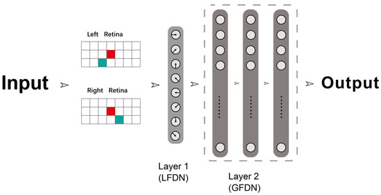 As shown in Figure 7, we proposed an artificial visual system to explain how the retina processes motion information. The visual system consists of sensory organs (eyes), pathways connecting the visual cortex and other parts of the central nervous system. Visual information in the receptor of eyes is projected onto the retinas of the left and right eyes. The information from the left and right retina is processed and delivered to Layer 1. The neurons in Layer 1, which are local feature detection neurons (LFDNs), are responsible for the detection of the motion direction that corresponds to the cortical neurons. Then, the information is transmitted to the Layer 2, where more complex features that correspond to the subsequent primate layer in the middle temporal (MT) area of the brain are assessed. Layer 2 is also regarded as the global feature detection neuron (GFDN) layer, which detects higher-order features.