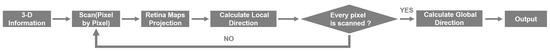 To verify the efficiency of the proposed mechanism, we conducted several computer experiments. We randomly generated a dataset consisting of 32 × 32 × 32 voxel images, where the light spots are random-dot patterns. In random-dot patterns, voxels are distributed randomly and discretely in space. The voxels in these images are from 1 voxel to 32 voxels and move randomly in one of the following 26 directions. Our algorithm flowchart is shown in Figure 8. We scan each voxel in the receptive field to acquire the local direction. In this part, we use a logic AND gate that accepts two signals A and B at the same time. We assume that the logic AND gate (defined as ANDGate) receives signals from two receptors A, B, and define their signals as SignalA, SignalB. We define * as logic AND operation.