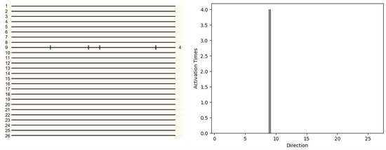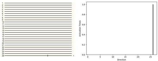 The neuron activation diagram in the twenty-six direction caused by the motion of the 4-voxel random-dot object in the three dimensional space (left). Each line represents 26 directions, each point on the line represents the detection neuron, and each stimulation on the line represents that the neuron at this point is activated. The number of activations is represented by a histogram (right). The number of activations of neurons in all directions is displayed on the histogram. The 1st-direction neurons have the highest number of activations. It can be inferred that the object moves in the 1st direction.